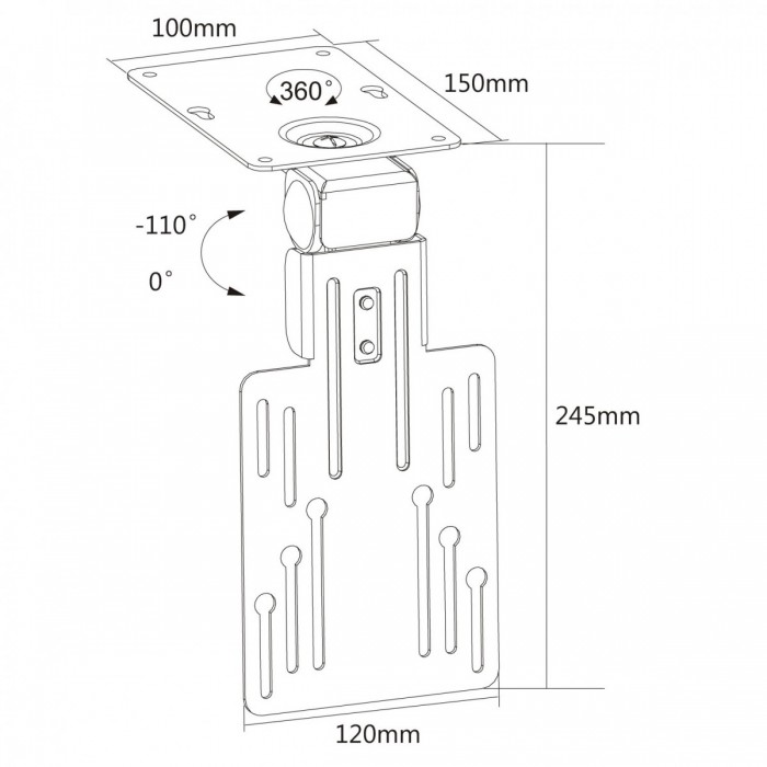 This bracket fits TVs with VESA mounting hole pattern of 50 x 50, 75 x 75 and 100 x 100. The bracket can rotate left and right by 360 degrees and tilt by -110 - 0 degrees. It also allows effortless mounting and dismounting of a wide range of flat panels.