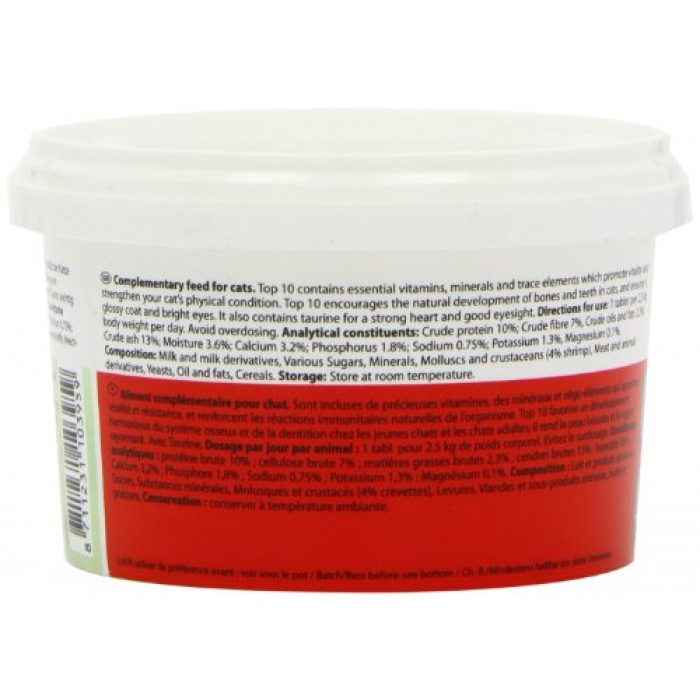 Top 10 contains essential vitamins minerals and trace elements which promote vitality and strengthen your cats physical condition. Top 10 encourages the natural development of bones and teeth in young and adult cats and ensures a glossy coat and bright eyes.