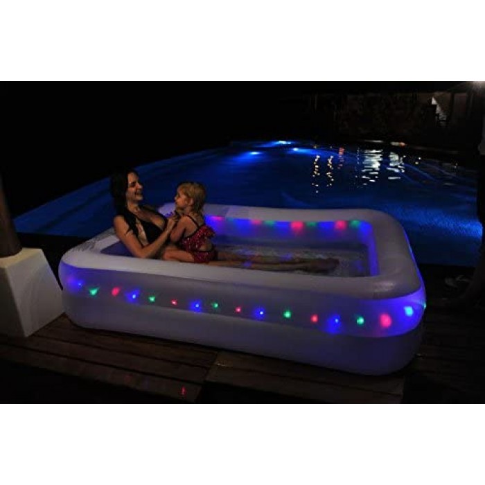 - INFLATABLE LIGHTED LED POOL: Great fun on the Holiday in the pool. Beautiful Designed that Attracts everyone. Enjoy your Holidays with your Partners at a Great Price. All our inflatable Pools are constructed for comfort and built to last. Led Lighted Inflatable Rectangular Pool is perfect for kids and family fun this summer in day and even more fascinating and enjoy full in night time with led lighting around the pool.
