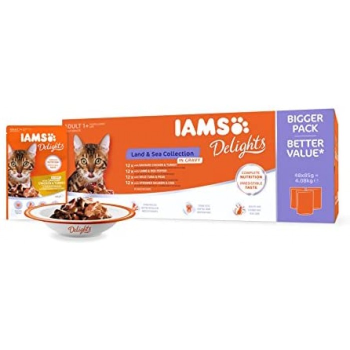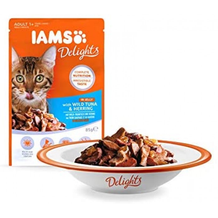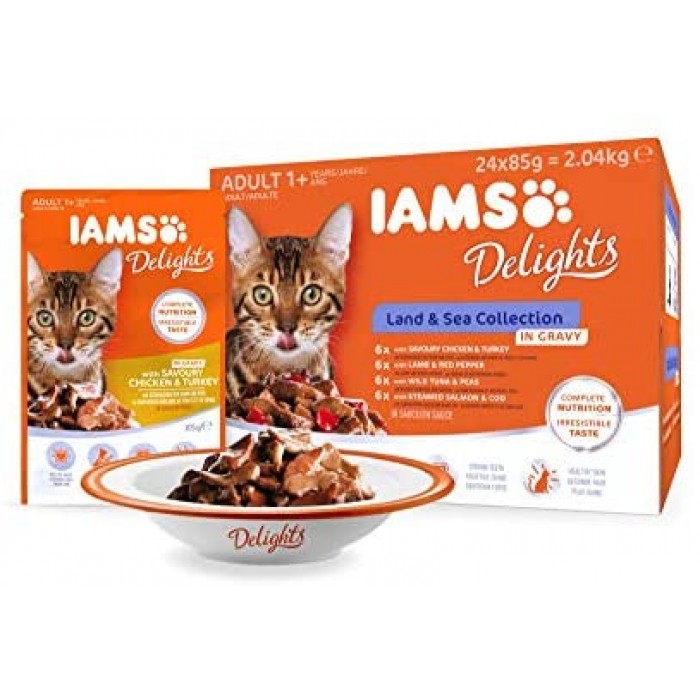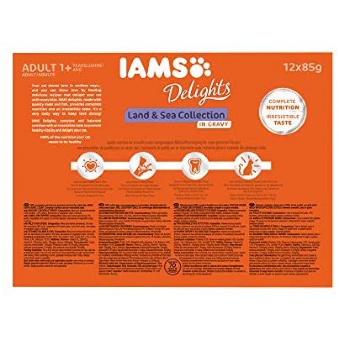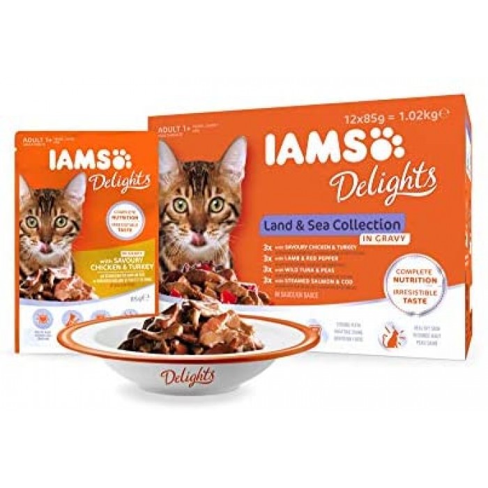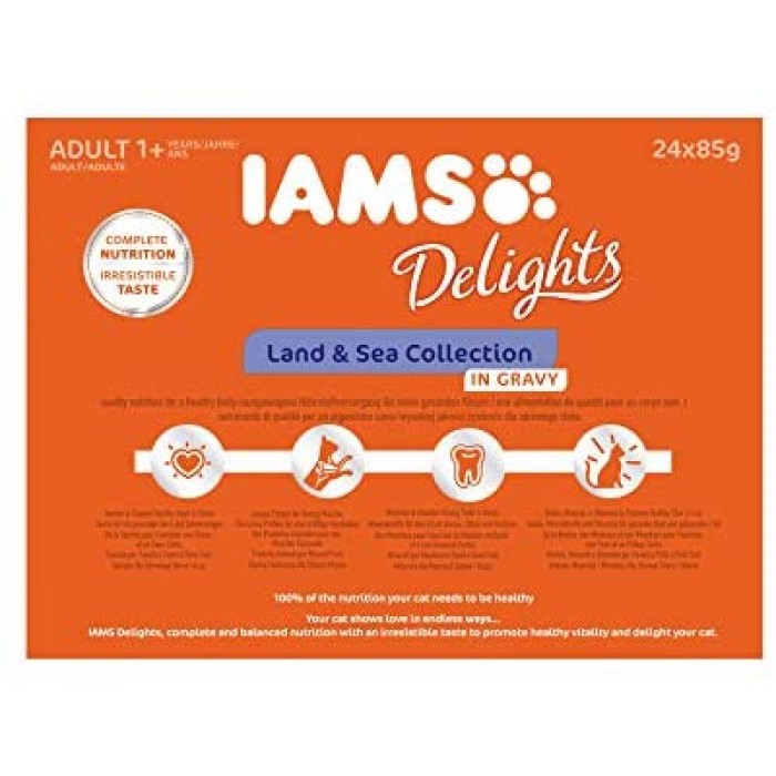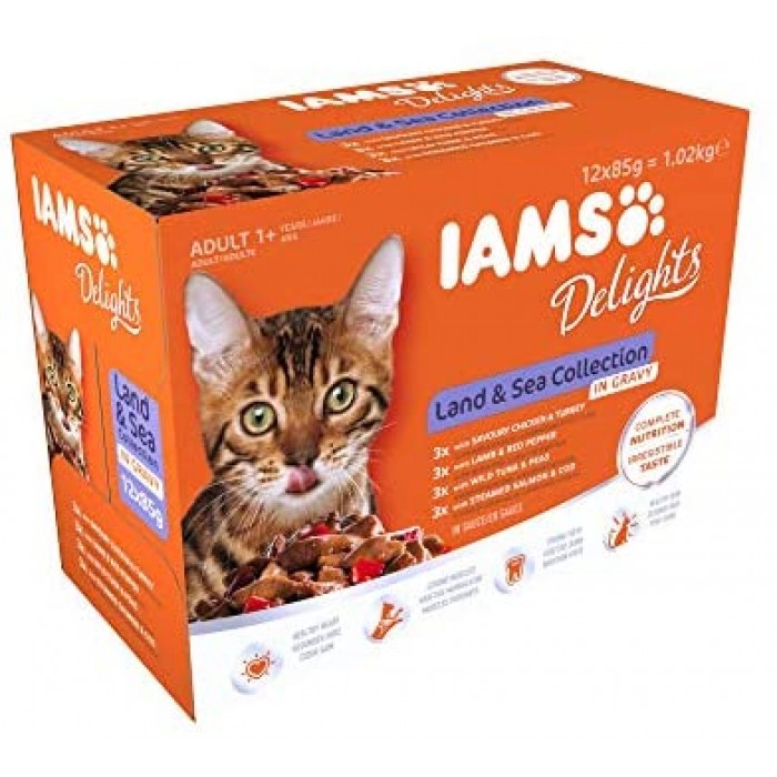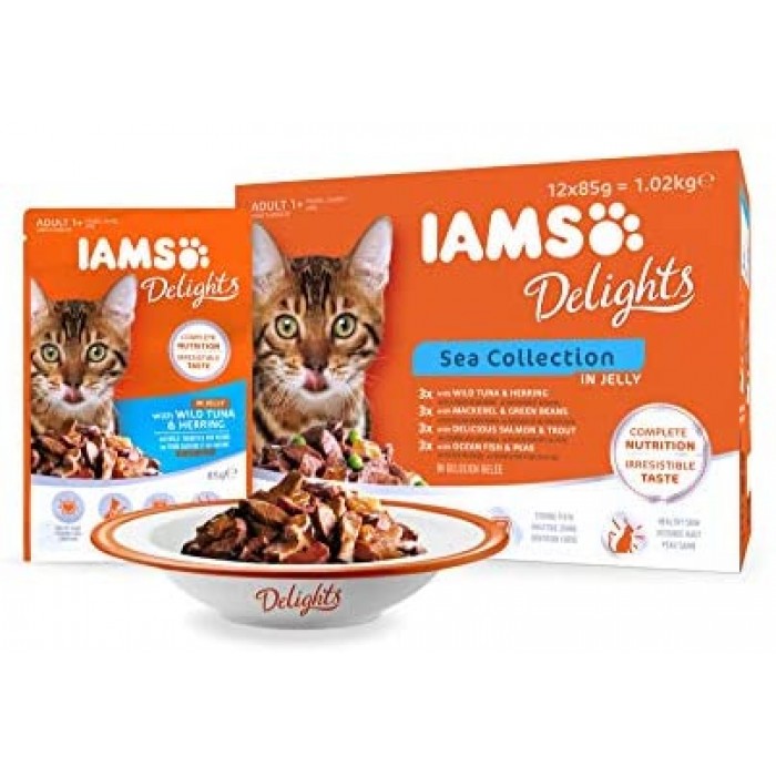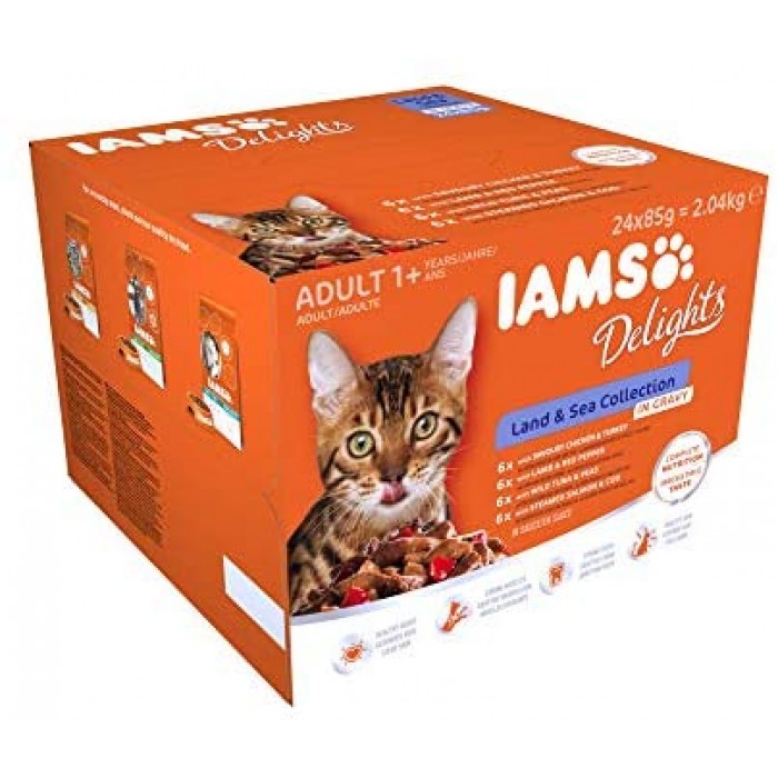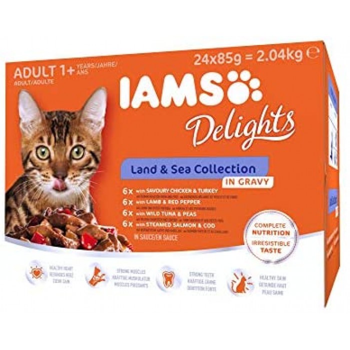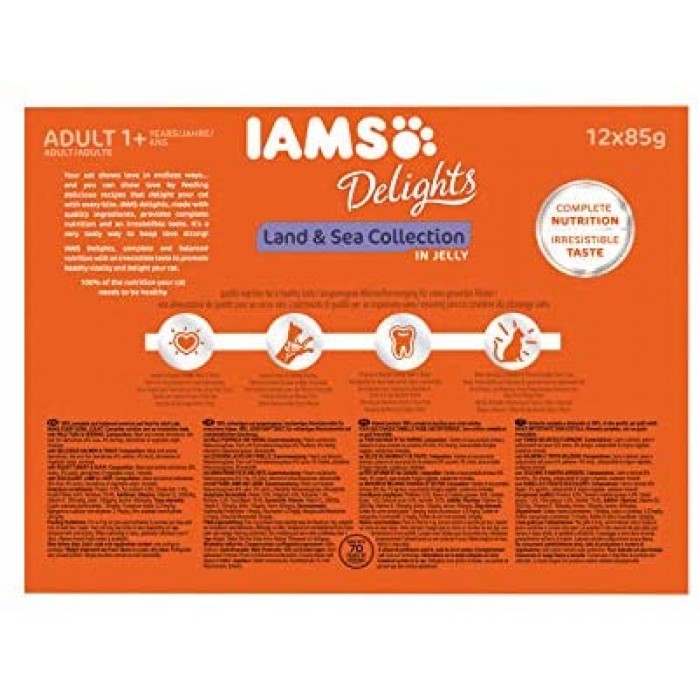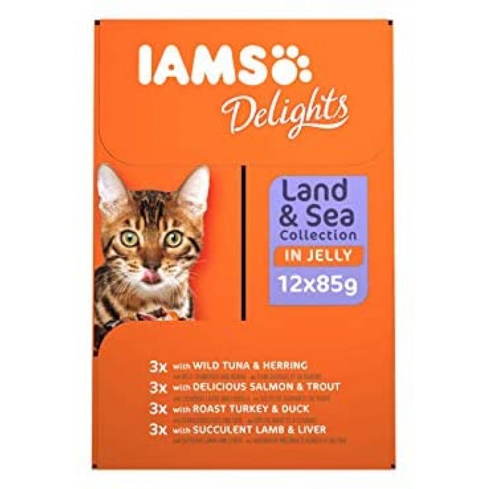 IAMS Delights adult cat food land & sea collection is a complete pet food. This balanced and delicious cat food in jelly has 100% of the nutrition your cat needs to be healthy. The land and sea collection includes wild tuna& herring, delicious salmon& trout, roast turkey& duck, succulent lamb& liver. Iams only use high quality ingredients: Animal protein for strong muscles, Taurine to support healthy heart and vision, Minerals to maintain strong teeth and bones, Biotin, minerals and vitamins to promote healthy skin and coat. Recommended for: Adult cats from 1 to 6 years