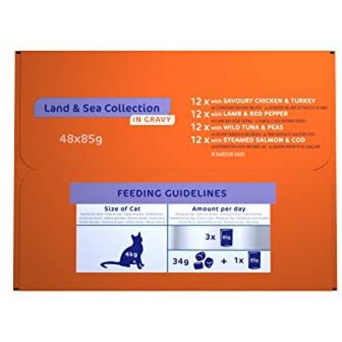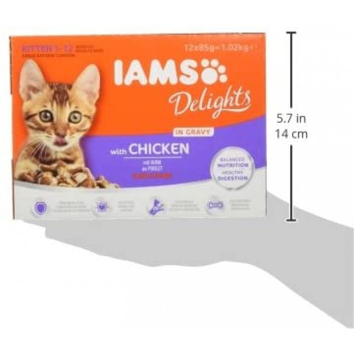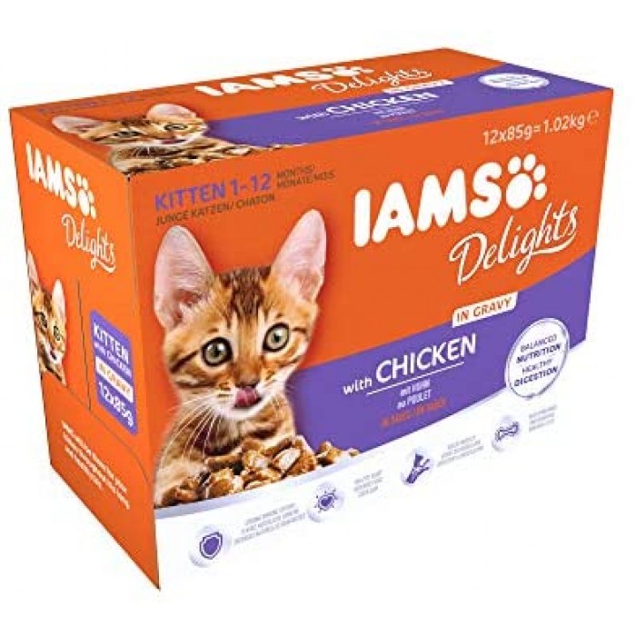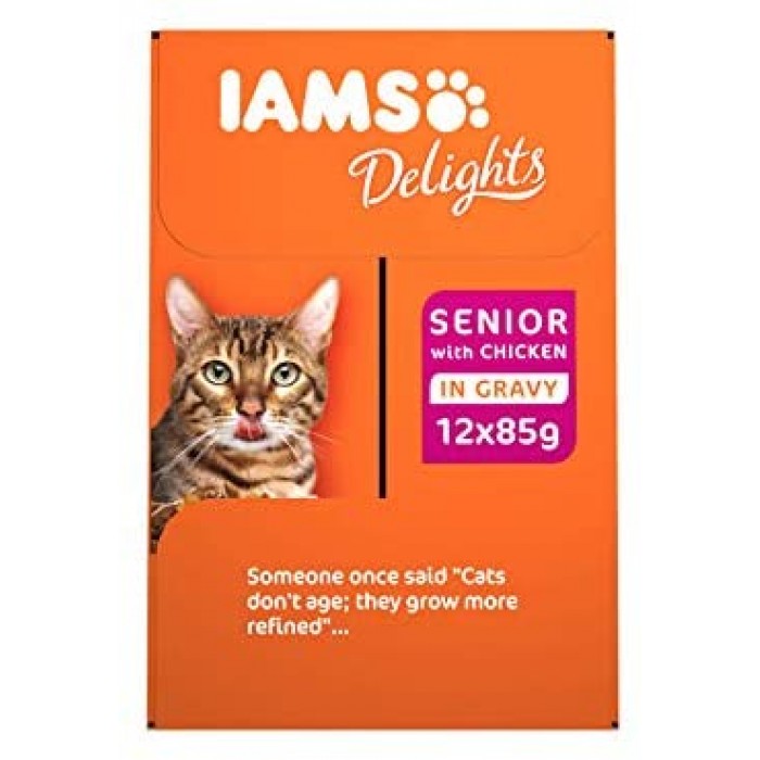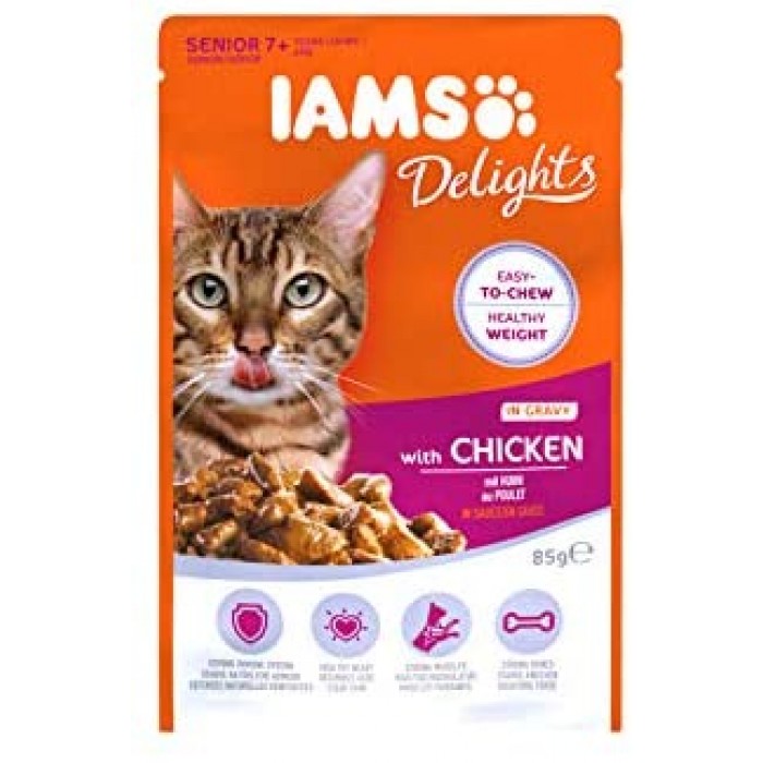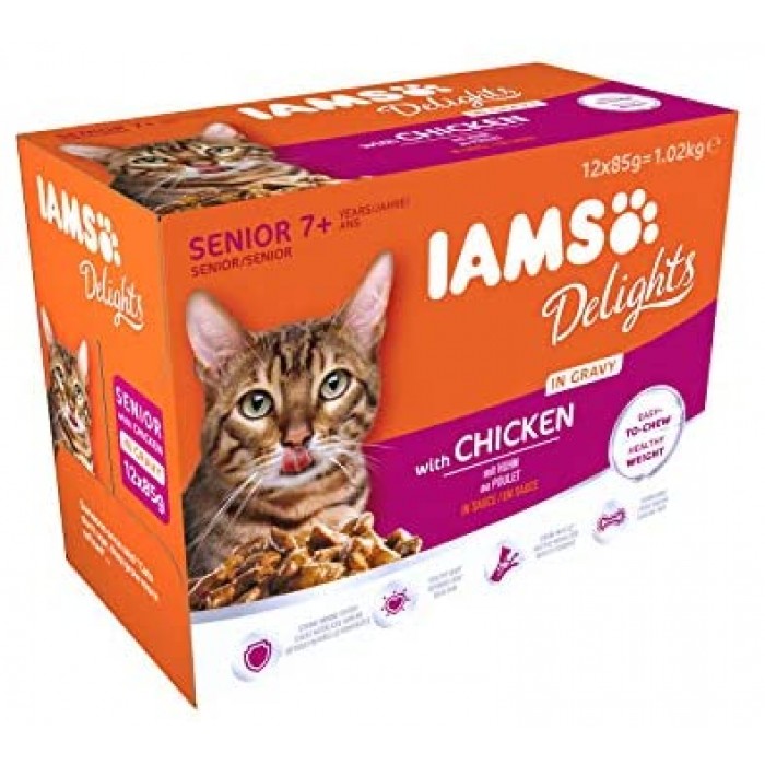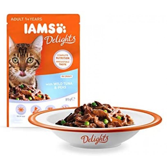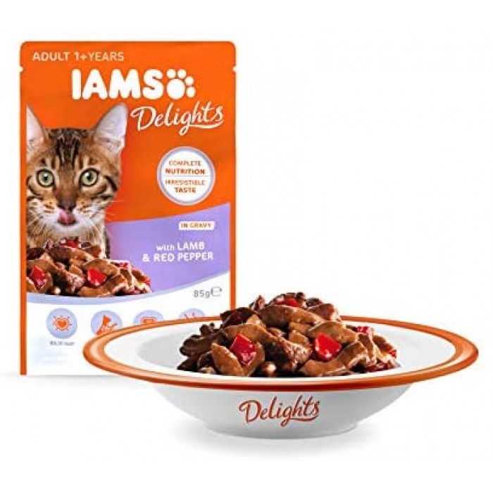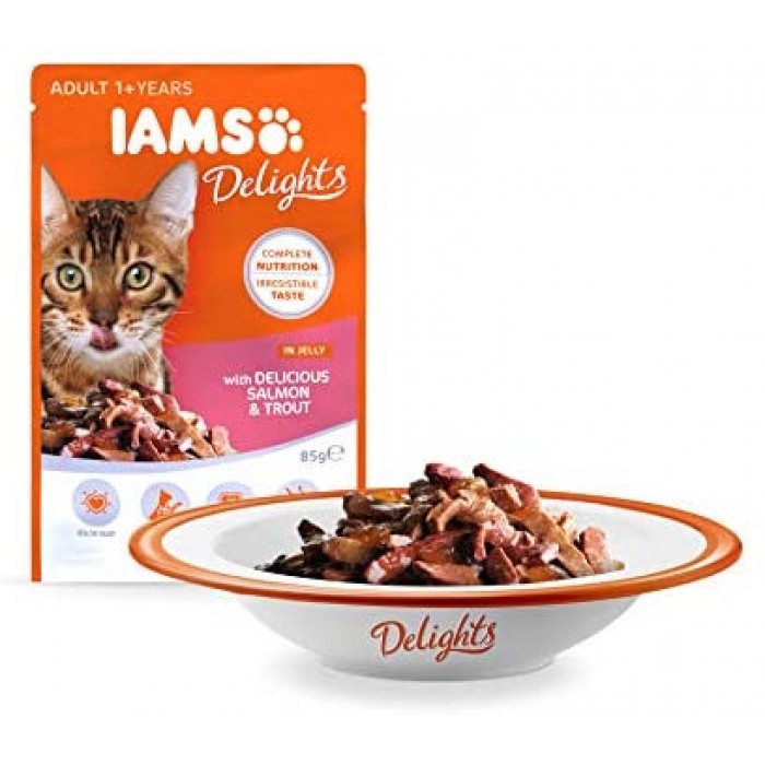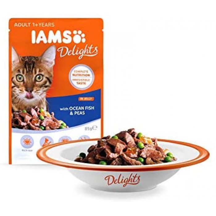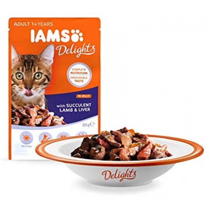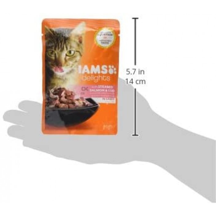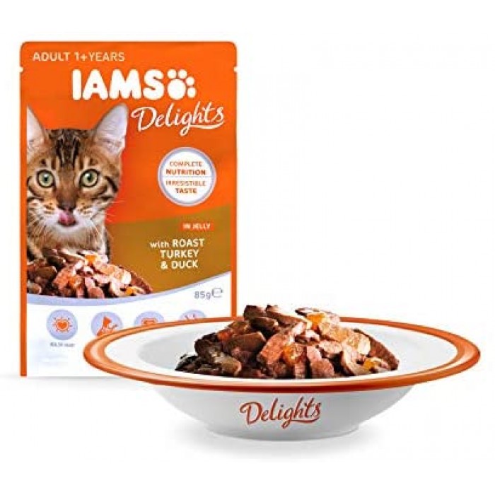 IAMS Delights adult cat food land & sea collection is a complete pet food. This balanced and delicious cat food in jelly has 100% of the nutrition your cat needs to be healthy. The land and sea collection includes wild tuna& herring, delicious salmon& trout, roast turkey& duck, succulent lamb& liver. Iams only use high quality ingredients: Animal protein for strong muscles, Taurine to support healthy heart and vision, Minerals to maintain strong teeth and bones, Biotin, minerals and vitamins to promote healthy skin and coat. Recommended for: Adult cats from 1 to 6 years