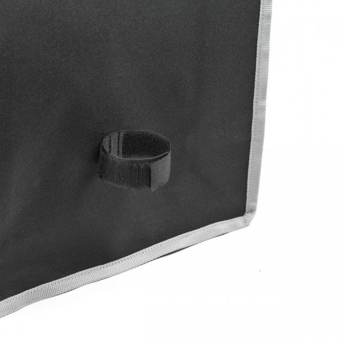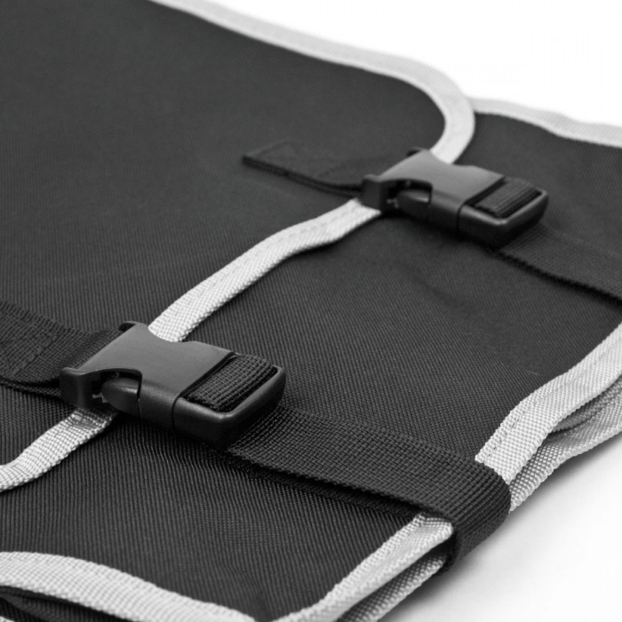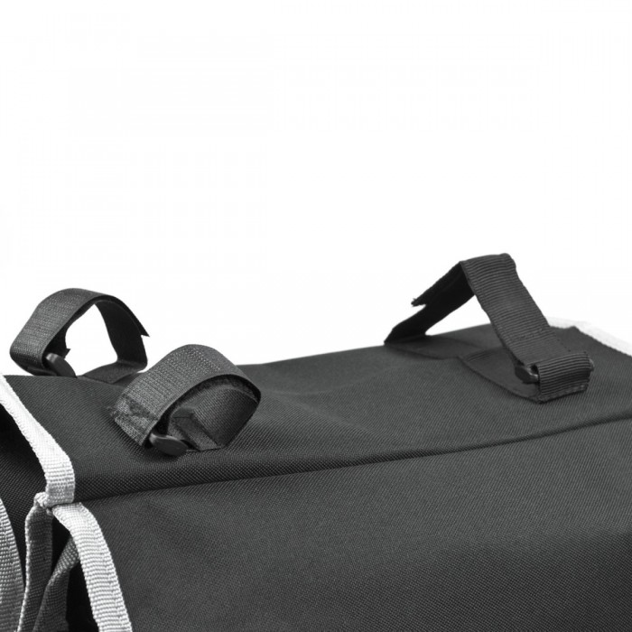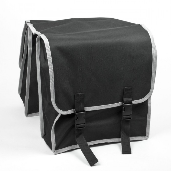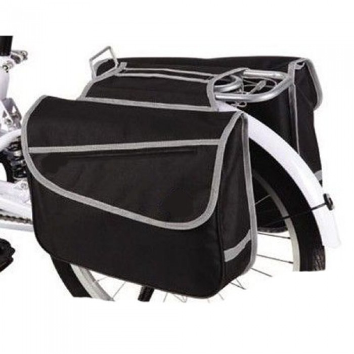 This Double Bicycle Pannier Bag is ideal for transporting a wide range of items when cycling. Use it to carry books, shopping, picnics, camping equipment, tools etc. when on the move. Made from durable, heavy duty water resistant nylon this Double Pannier Bag will provide years of use. It features two large Velcro down pockets with reflective safety strips (rack not included) and a zip up pocket on the outside of each side.