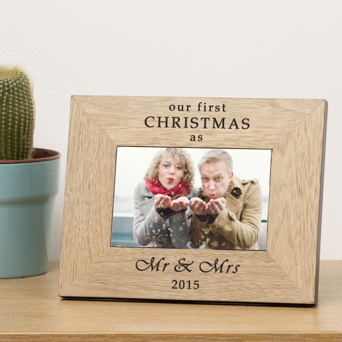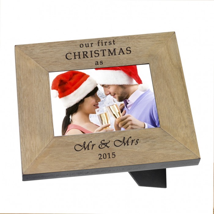 The top is engraved " Our First Christmas as " The bottom of the frame is engraved ".Mr & Mrs" with a year of your choice.