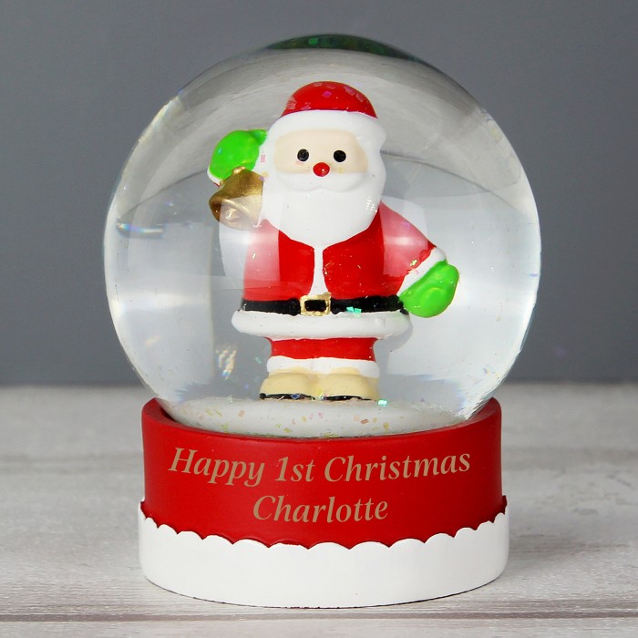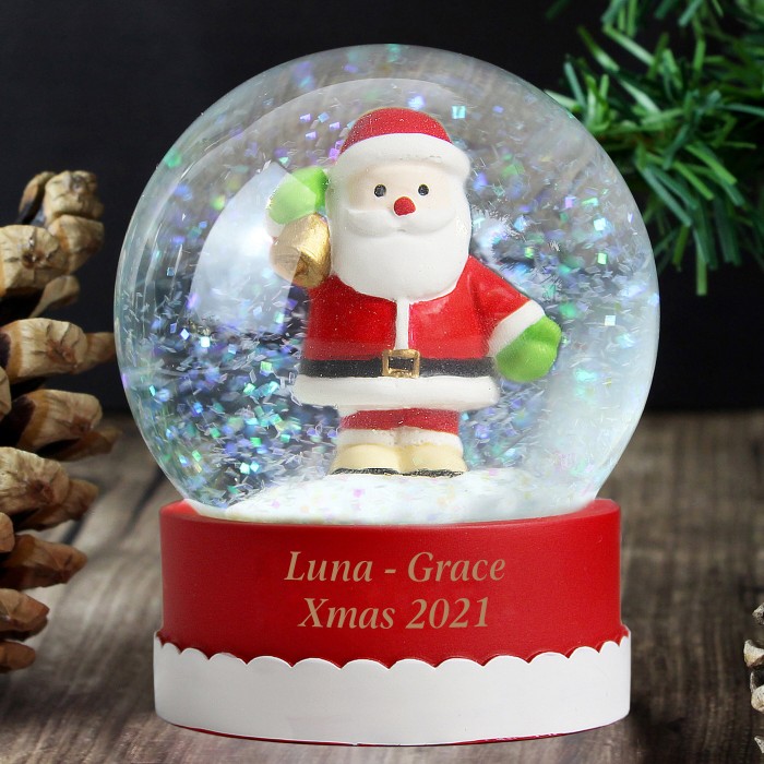 Personalise this ornamental Santa Snow Globe with a message over two lines, using up to 20 characters per line.