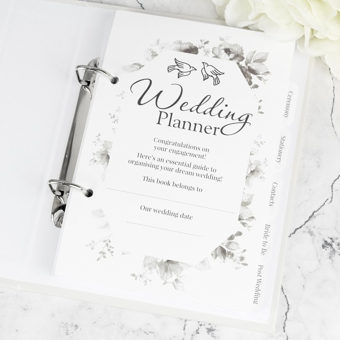 This ring-bound wedding planner includes sections for the ceremony, stationery, contacts, Bride to be and post wedding.
