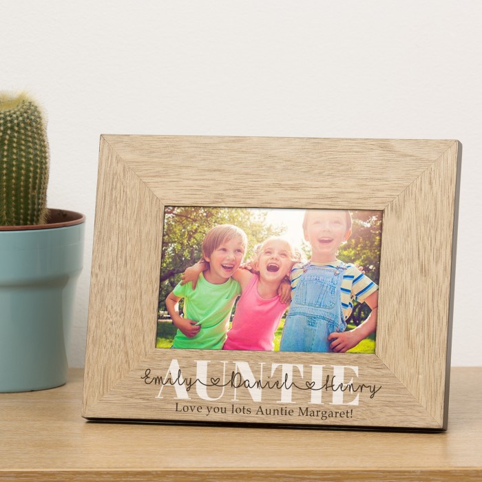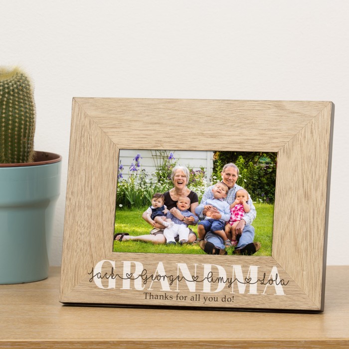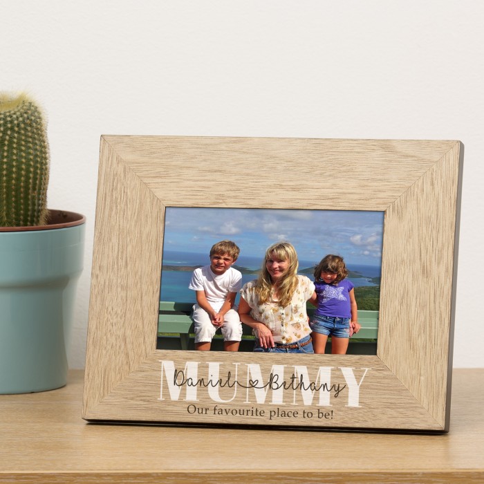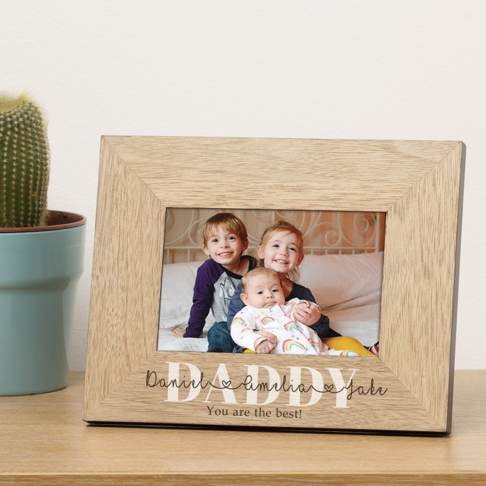 A stylish personalised oak finish photoframe. The recipient's name is printed in large capital letters (ie DADDY). Upto 5 additional names can be added in a script font running through the recipients name. A personalised message can be added to complete the design. The frame holds a 6 x 4 photograph (Outer dimensions are 220mm x 170mm)