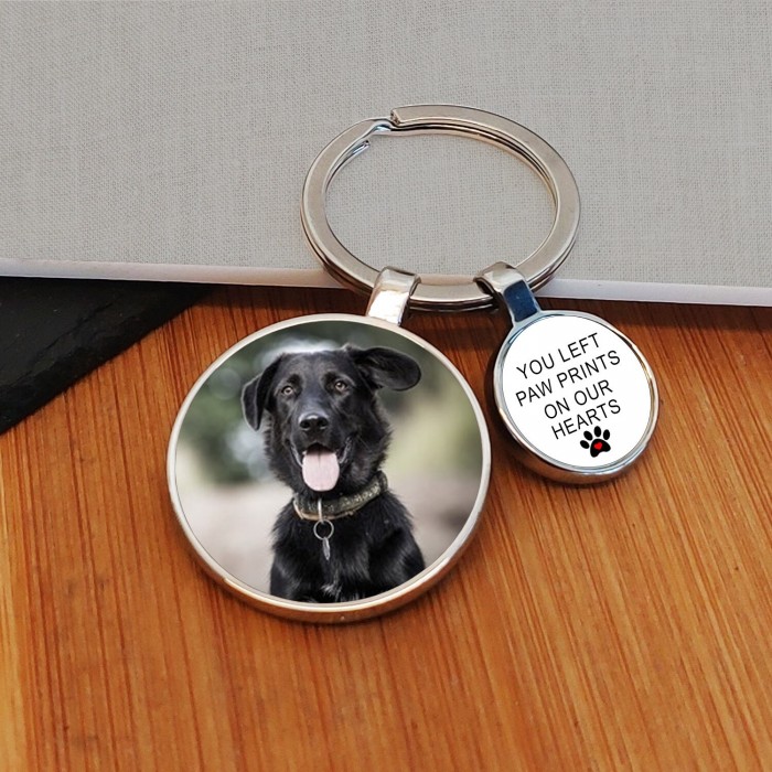 Choose a favourite photo to add to this beautifully made 'You Left Pawprints On Our Hearts' Charm metal key ring. The perfect gift for any pet lover. Solid metal key ring with round charm.