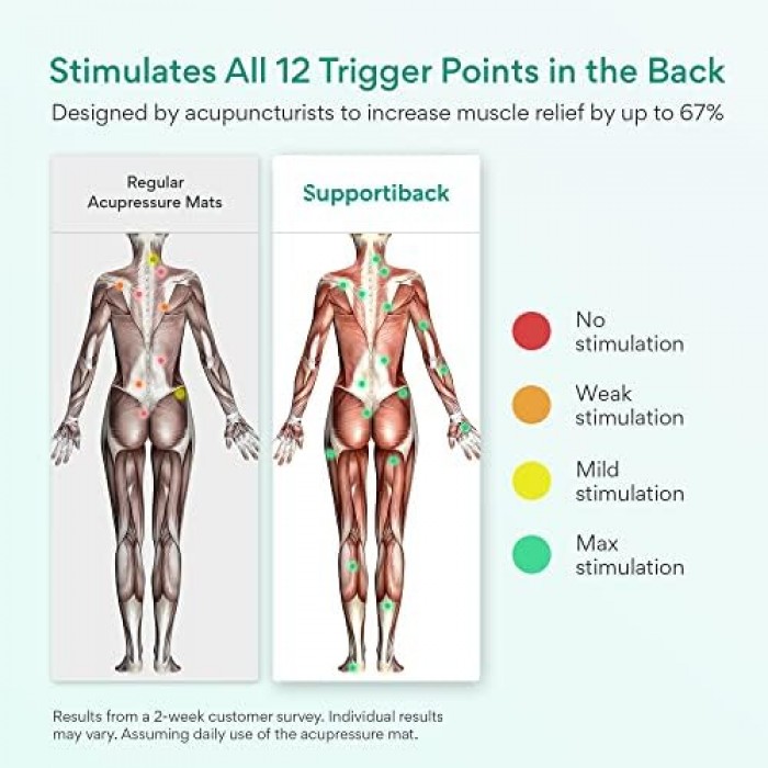 MIMICS TRADITIONAL TECHNIQUES: Our targeted therapy mat mimics the classic Chinese acupuncture techniques. In a survey of 40 users in July 2022, 96% said that their back discomfort significantly improved after using our mat for just 10-15 minutes per day.