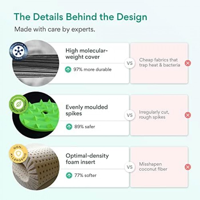 ULTRA-TARGETING SPIKES: Stress is reduced by up to 67% thanks to our mat’s generous 2,160 therapy points, designed to reach all pressure points in the back, neck and shoulder areas.